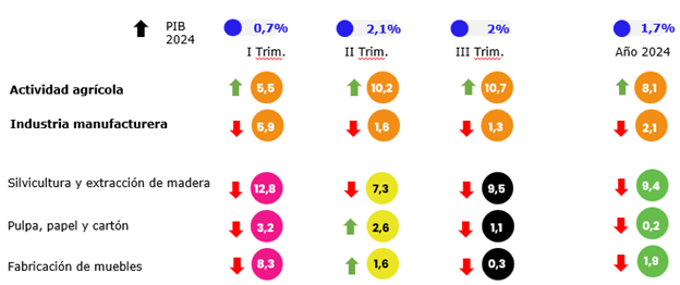 Y es que a pesar del crecimiento del 8,1% en la actividad agrícola consolidada, es claro que las actividades de silvicultura y extracción de madera decrecieron en 2024 un 9,4%, la transformación de madera (productos derivados, pulpa, papel y cartón, entre otros) un 0,2% y la fabricación de muebles un 1,9%, respectivamente, lo que se suma a una tendencia constante de caída de las cifras trimestre tras trimestre, como lo ilustra la gráfica.