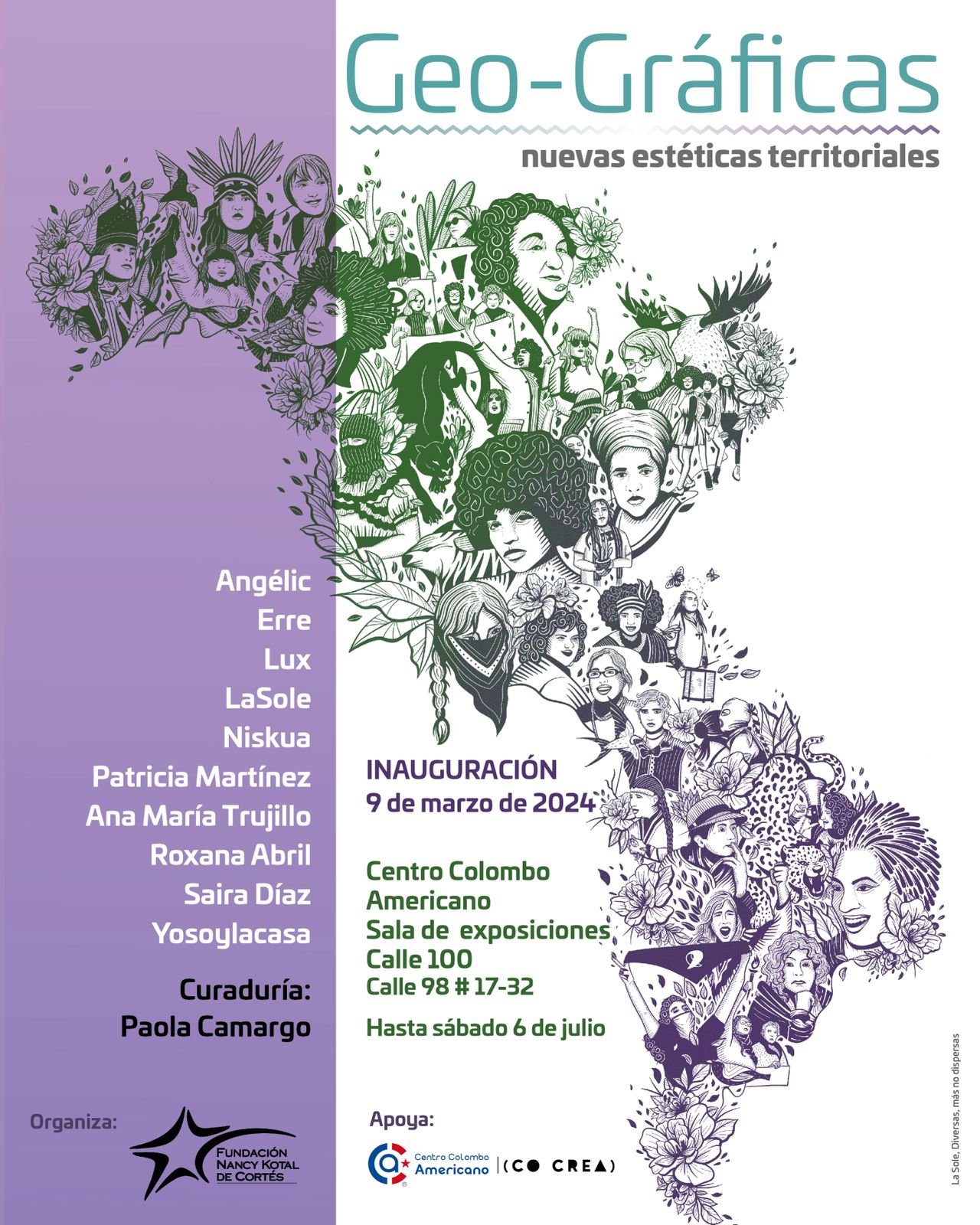 La Fundación Nancy Kotal de Cortés con el apoyo del Centro Colombo Americano de Bogotá presentan Geo-Gráficas: nuevas estéticas territoriales. Una exposición que reúne a un grupo de diez jóvenes mujeres artistas. Ellas provienen de San Juan del Cesar (La Guajira), Ipiales y Pasto (Nariño), Puerto Asís (Putumayo), Santa Rosa de Cabal (Risaralda), Mariquita (Tolima), Zipaquirá (Cundinamarca) y Bogotá. Jóvenes ilustradoras, dibujantes y diseñadoras que exploran temas sociales o personales (el feminismo, la cultura popular, la violencia, el amor) desde distintas perspectivas y a través de diferentes lenguajes.