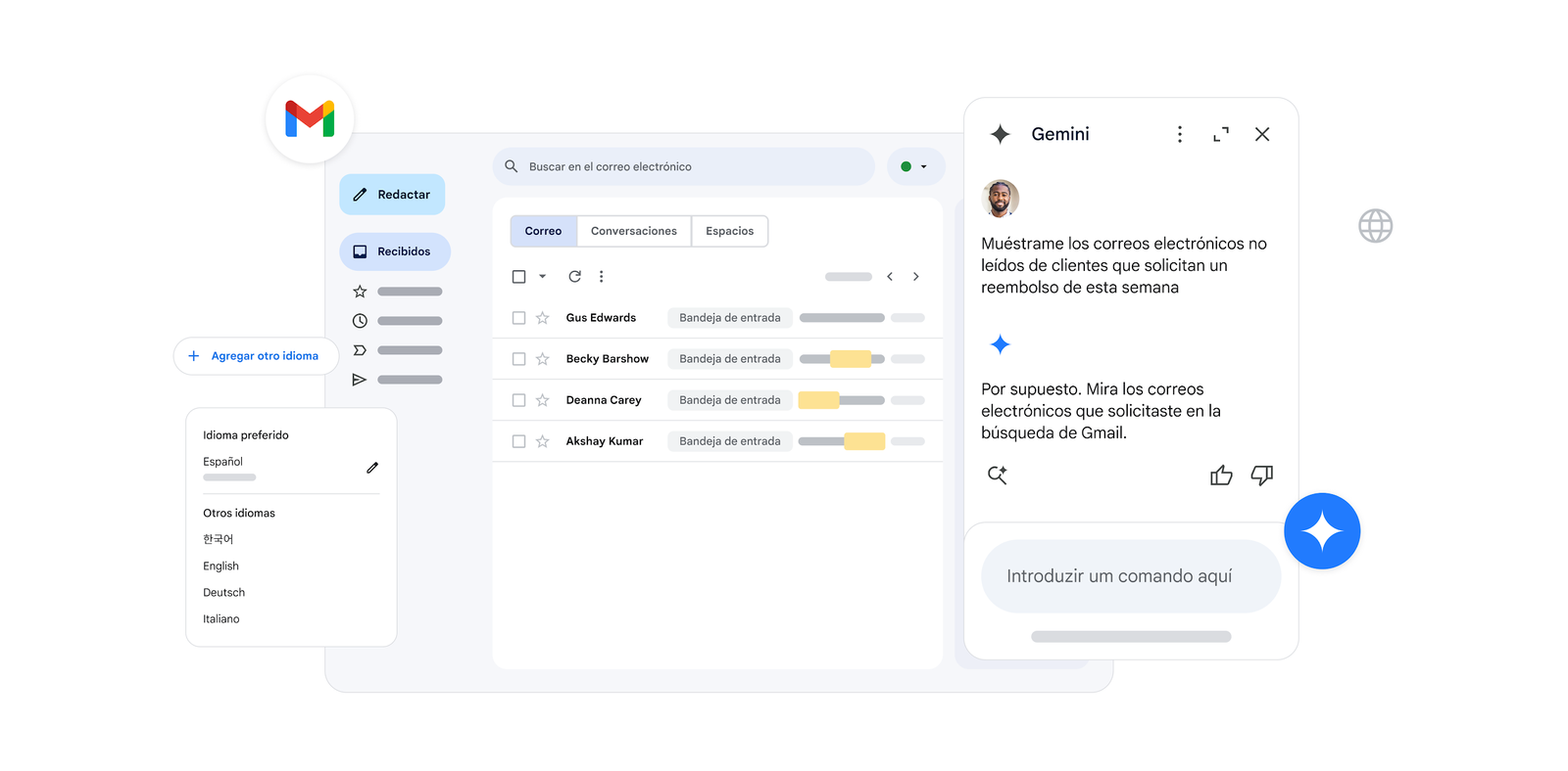 En Gmail se puede resumir una cadena de mensajes de correo electrónico, sugerir respuestas, hacer preguntas y buscar información directamente desde la bandeja de entrada. Al hacer clic sobre el ícono Preguntale a Gemini () en la esquina superior derecha se abrirá el panel y allí se puede seleccionar una sugerencia o formular una pregunta libre como por ejemplo «¿Cuándo es la próxima reunión del equipo?». Además, con la herramienta “preguntas y respuestas” puede hacer consultas como mostrar mensajes no leídos, ver mensajes de un remitente específico o resumir correos electrónicos sobre un tema.