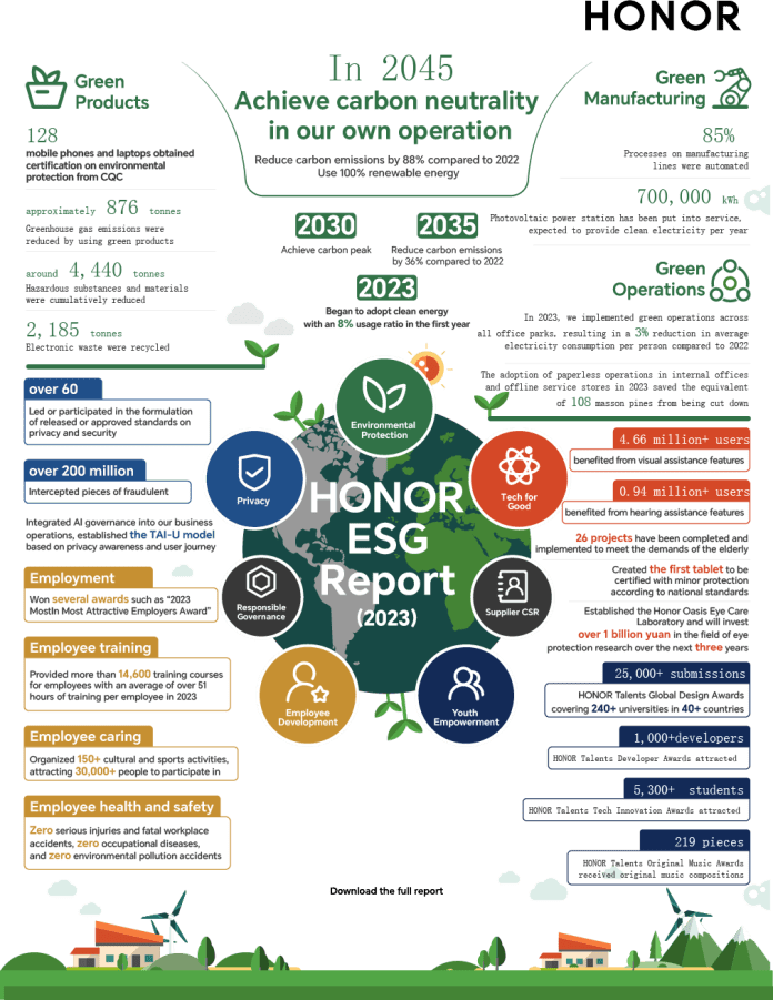 Como destacada marca global de tecnología, HONOR sitúa los principios ESG como un enfoque estratégico a largo plazo, que abarca siete áreas clave: Protección Ambiental, Tecnología para el Bien, Privacidad, Empoderamiento Juvenil, Responsabilidad Social de los Proveedores, Desarrollo de Empleados y Gobernanza Responsable.