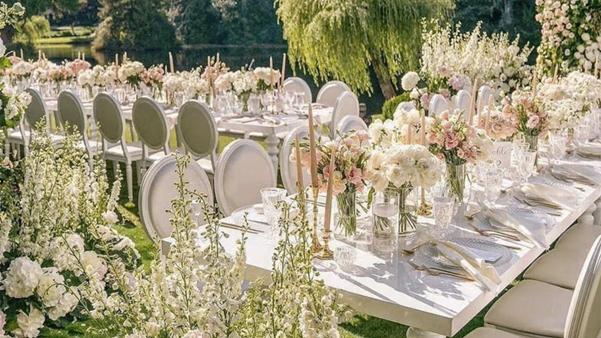Publicando fotos en sus redes sociales, Maribel exhibe decoraciones asequibles como guirnaldas de flores, servilleteros de perlas, cubiertos de acero inoxidable bañados en oro y mini atriles dorados para crear un ambiente real y aristocrático.