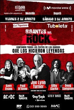 Medellín vibrará al ritmo de las guitarras, la batería y la potente voz de los talentos que traerán al país la vibra rockera más poderosa de la mano de los “Gigantes del Rock”la cita es el próximo viernes 2 de agosto en el Pabellón Amarillo de Plaza Mayor. Por su parte Bogotá vibrará al ritmo del rock en el Movistar Arena, en lo que será la cita perfecta de los amantes del rock clásico en la capital. La edad mínima para asistir al concierto es de 18 años Las boletas para Bogotá están disponibles en @TuBoleta y para la capital de Antioquia se encuentran en @LaTiquetera.