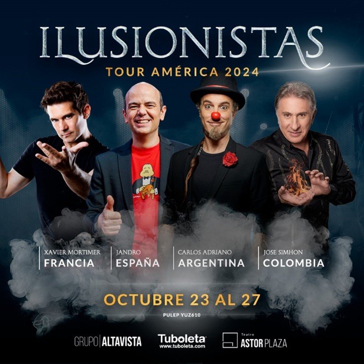 Después del rotundo éxito en 2023, el espectáculo de magia más esperado regresa con una nueva gira. Ilusionistas Tour América 2024 trae una nómina de lujo este año con la presencia de relevantes figuras procedentes de Francia España, Argentina y Colombia. Xavier Montimer, Jandro, Carlos Adriano y José Simhon serán los encargados de llevar los mejores espectáculos de magia e ilusionismo en un viaje de fantasía que llevará a los espectadores a vivir en familia de una verdadera noche cargada de emociones, risas y asombrosos performances, del 23 al 27 de octubre en el Teatro Astor Plaza.