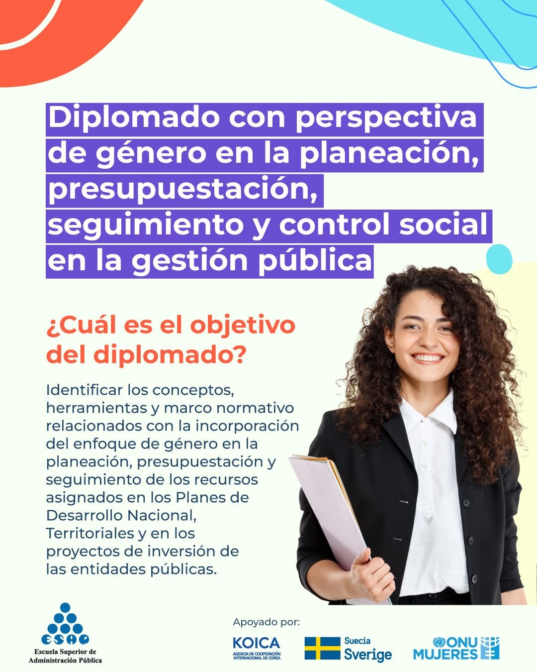 La Escuela Superior de Administración Pública (ESAP), en alianza con el Departamento Nacional de Planeación y el Viceministerio de las Mujeres, y con el apoyo de ONU Mujeres, la Agencia de Cooperación Internacional de Corea (KOICA) y la Embajada de Suecia, abre inscripciones para el Diplomado en Presupuestos con Enfoque de Género.