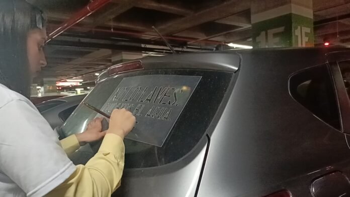 La estrategia para llamar la atención del público consiste en “imprimir sellos” en los carros sucios, con mensajes como NO LO LAVES . CUIDEMOS EL AGUA.