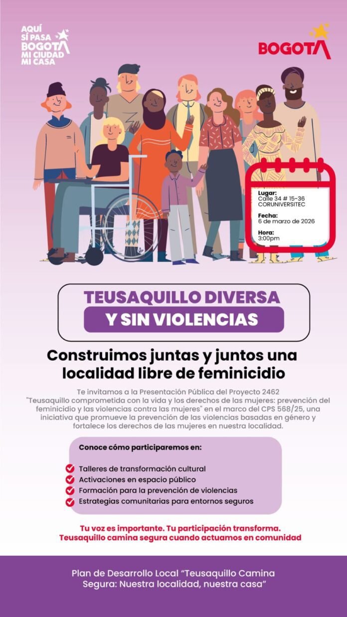 En el marco del Plan de Desarrollo Local “Teusaquillo Camina Segura: Nuestra localidad, nuestra casa”, la Alcaldía Local de Teusaquillo realizará la presentación pública del Proyecto 2462, una iniciativa orientada a la prevención del feminicidio y de las violencias basadas en género.